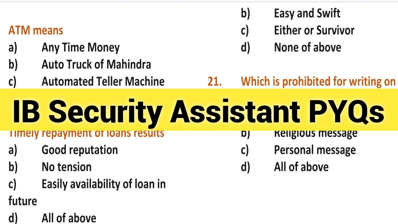 Prepare effectively for the Intelligence Bureau Security Assistant (IB SA) exam with this comprehensive set of previous year style questions covering General Awareness, Reasoning, Numerical Ability, and English. Each question is designed with four multiple-choice options and supported by detailed explanations to help you understand concepts clearly. Topics include Indian Constitution, current affairs, arithmetic, logical reasoning, grammar, and vocabulary, ensuring complete practice for the exam. By solving these PYQs, candidates can boost accuracy, improve speed, and strengthen problem-solving skills, making them well-prepared for the actual IB Security Assistant examination.
